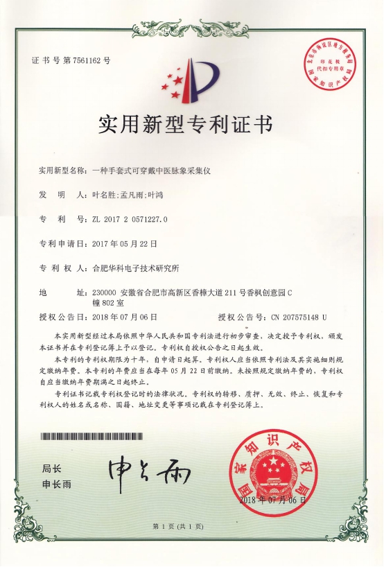 近日,我所的又一研發(fā)成果--“一種手套式可穿戴中醫(yī)脈象采集儀”通過了國家知識(shí)產(chǎn)權(quán)局的審查,獲得了國家實(shí)用新型專利授權(quán),取得了實(shí)用新型專利證書,專利號(hào):ZL 2017 2 0571227.0。