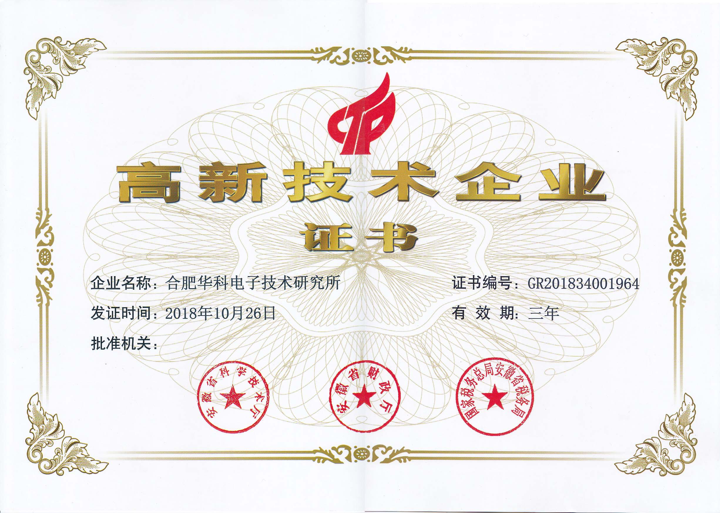 我所于2014年首次通過高企認(rèn)定,此次認(rèn)定系原證書有效期滿后所進(jìn)行的重新認(rèn)定,將再次獲得由安徽省科學(xué)技術(shù)廳、安徽省財(cái)政廳、國家稅務(wù)總局安徽省稅務(wù)局聯(lián)合批準(zhǔn)下發(fā)的“高新技術(shù)企業(yè)”證書(證書編號:GR201834001964)。